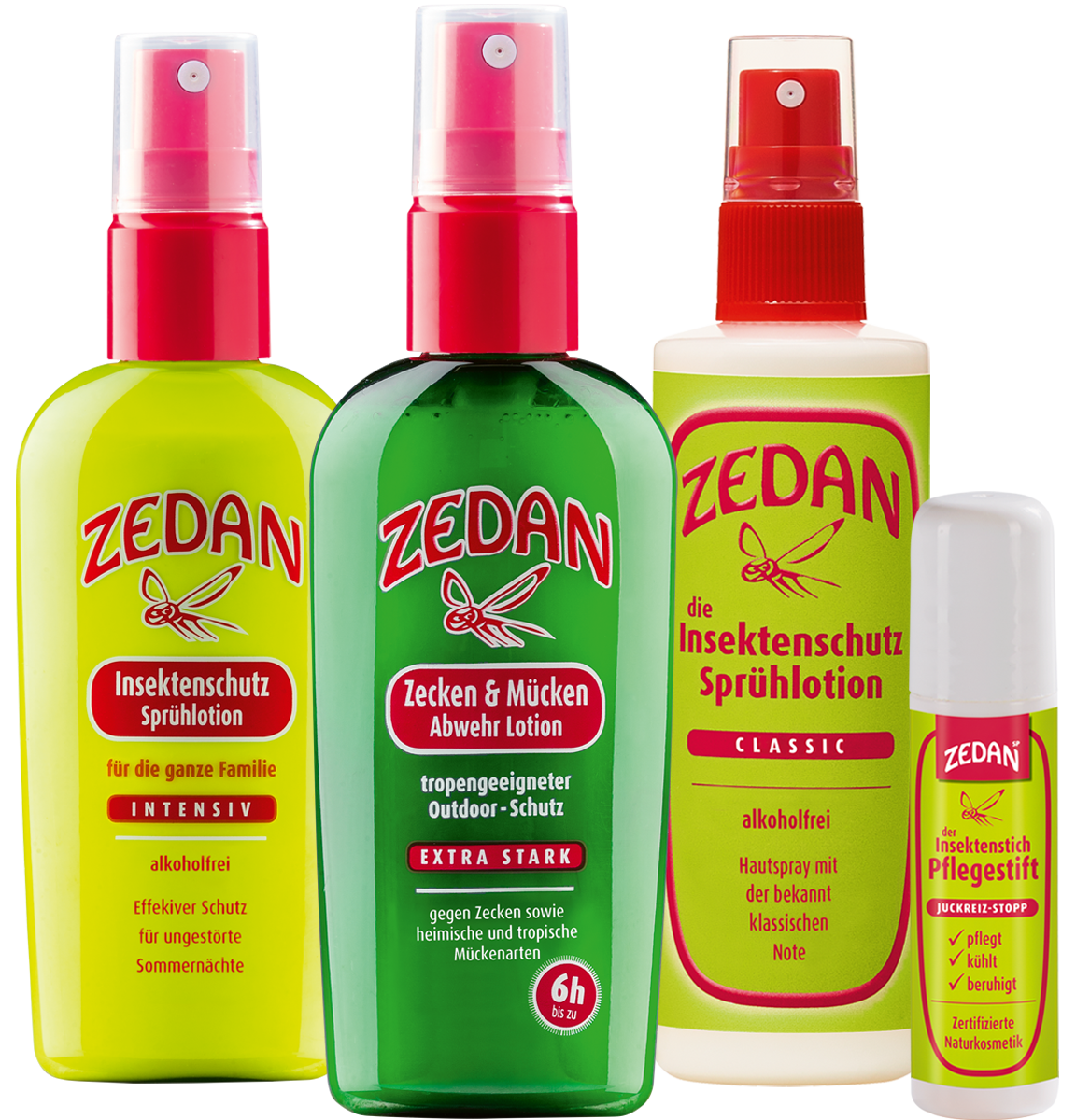 Unsere ZEDAN Insektenschutz-Sprühlotion ist ein perfektes Beispiel dafür: eine hochwirksame, alkoholfreie Rezeptur, die seit über 30 Jahren nahezu unverändert bewährt ist. Unabhängige Tests geben uns recht – zum Beispiel kürte das WISO Magazin unser ZEDAN zum beliebtesten Mückenschutzmittel unter Anglern. Trotzdem entwickeln wir uns natürlich weiter und bieten z.B. mit der ZEDAN Zecken und Mücken Abwehrlotion ein Produkt, das auch höchsten Ansprüchen in tropischen Gebieten gerecht wird.