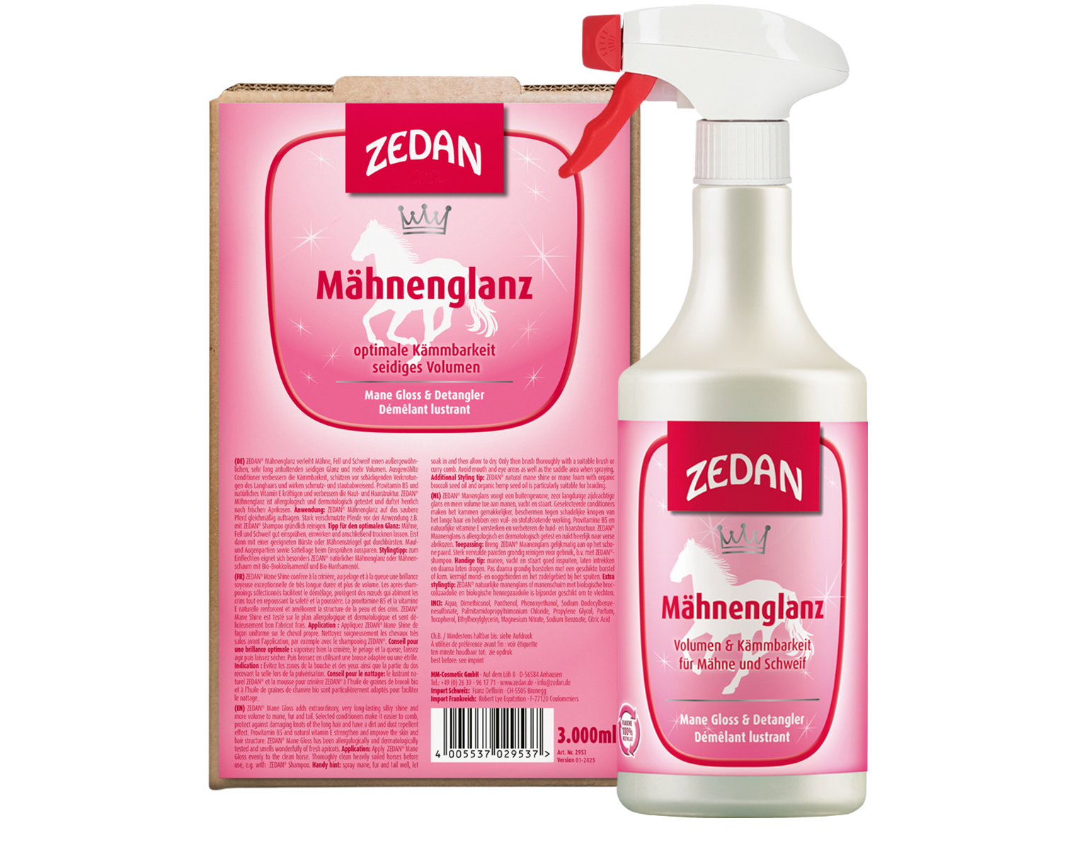 Auf das nasse Pferdehaar sprühen, einmassieren und kurz einwirken lassen. Danach gründlich ausspülen. Schweif und Mähne können im Anschluss mit ZEDAN Natürlichem Mähnenglanz behandelt werden.